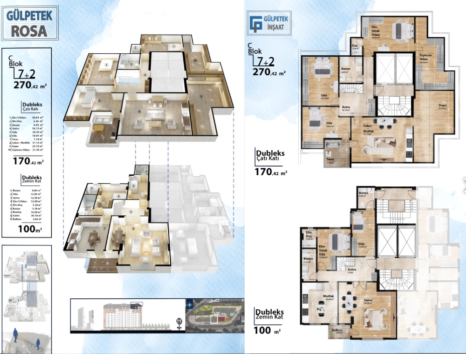 Роза Кент предлагает продуманные жилые помещения, которые удовлетворяют широкий спектр потребностей, с вариантами апартаментов от 2+1 до 7+2 дуплексов. Размеры варьируются от 78 м2 для компактных, но функциональных макетов до 300 м2 для просторных семейных домов, включая садовые, средние и дуплексные конфигурации. Каждая резиденция имеет хорошо спланированные интерьеры с яркими гостиными, современными кухнями и практичными планировками, которые максимизируют комфорт и естественный свет, создавая идеальную среду для семей и профессионалов, ищущих качественную жизнь в Мальтепе.