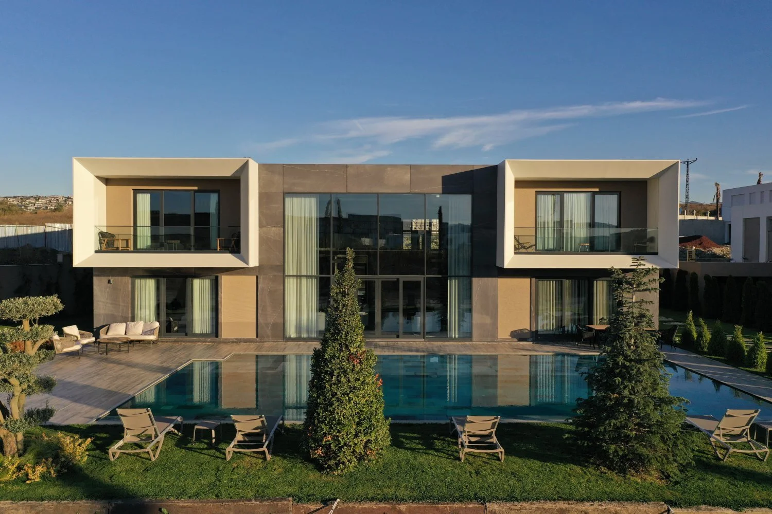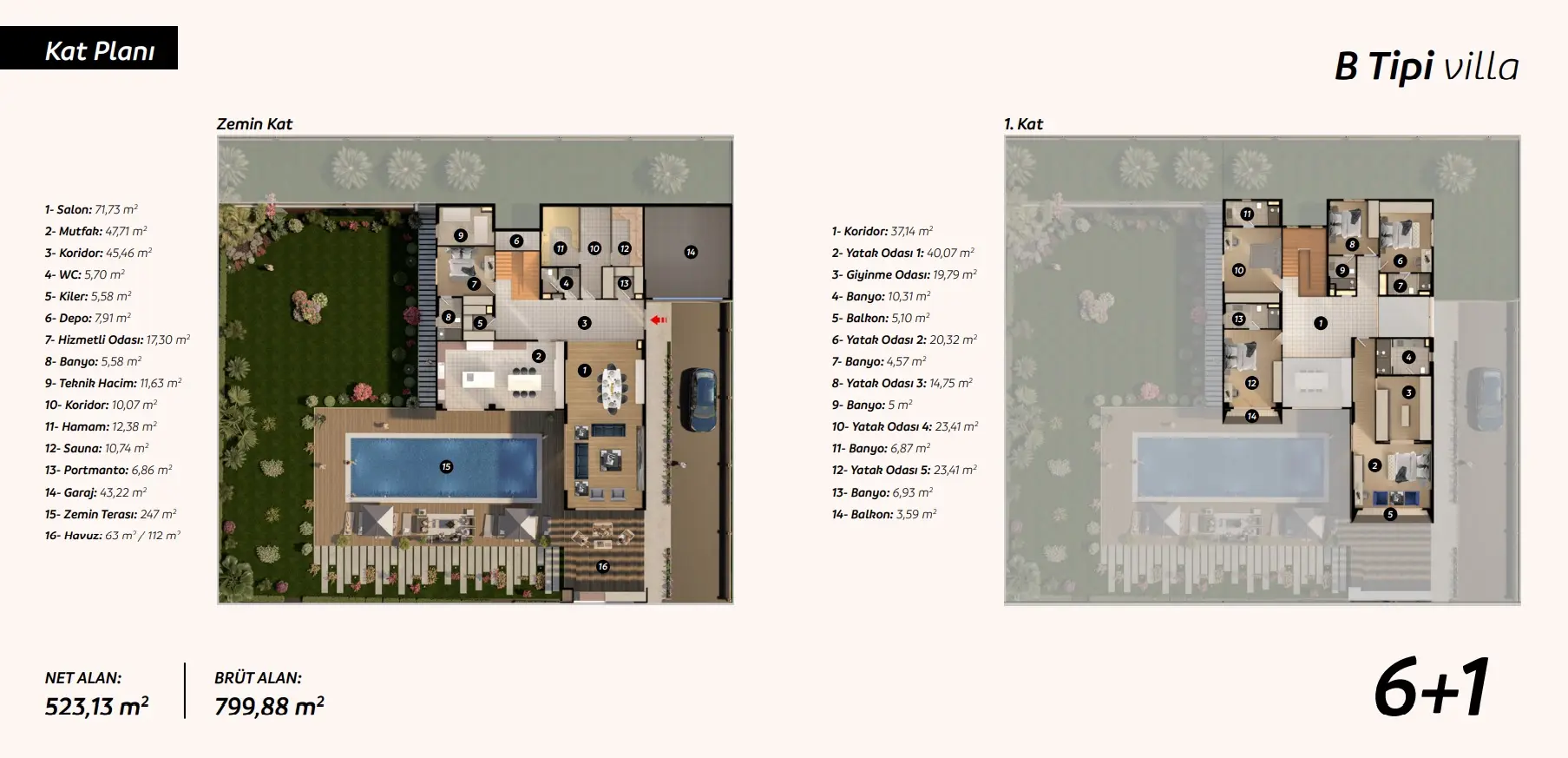 Виллы предлагаются в 6+1 и 7+1 конфигурациях, с размерами участка от 1300 м2 до 2500 м2. Каждая вилла включает в себя частный бассейн, частный сад и крытые удобства, такие как турецкая баня, сауна, кинозал и музыкальная студия. Умные домашние системы контролируют освещение, отопление, охлаждение и безопасность, обеспечивая как комфорт, так и эффективность. Дома разработаны, чтобы сбалансировать роскошь в помещении с обширным открытым пространством, идеально подходящим для семейной жизни или частных развлечений.
