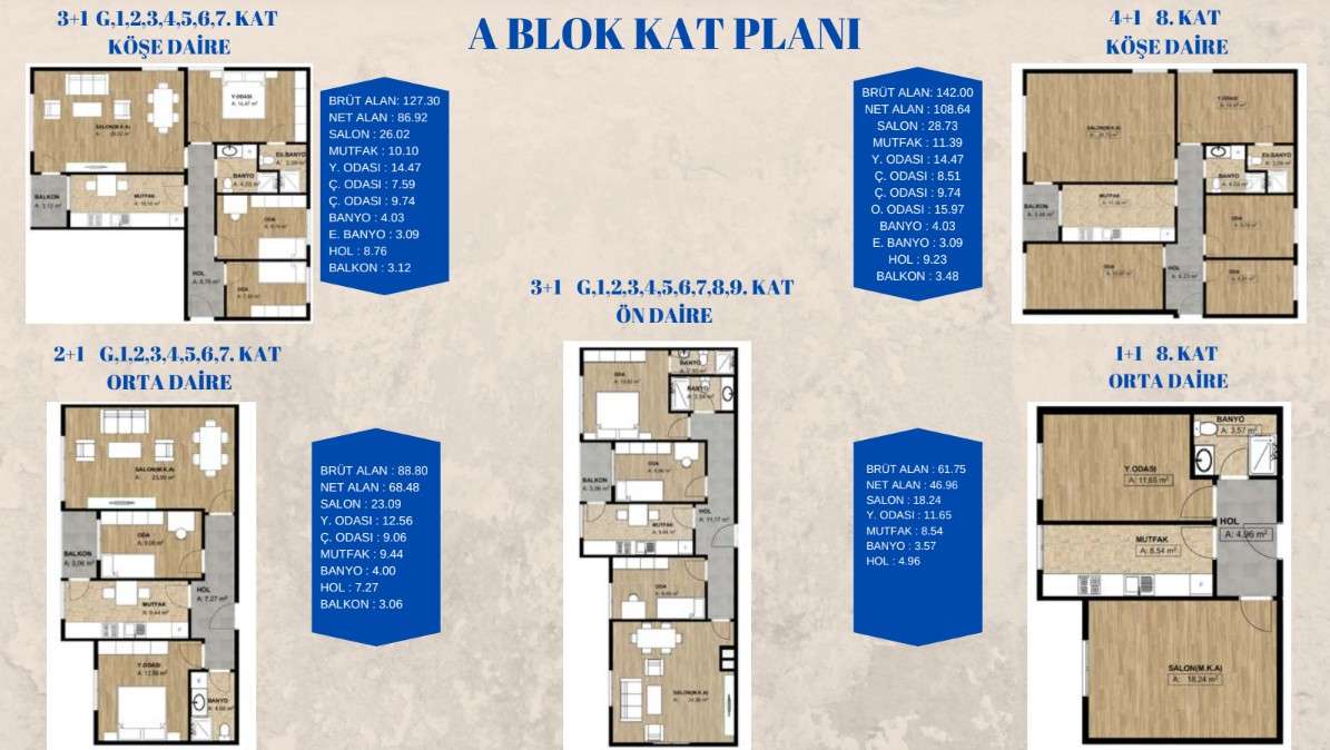 Апартаменты в Lebi Derya Диапазон Evleri варьируется от 2+1 до 5+1 дуплексных блоков, предназначенных для максимизации функциональности, дневного света и комфорта. Единицы включают ванные комнаты, большие балконы или террасы, отдельные кухни (в большинстве единиц) и достаточно места для хранения. Апартаменты, обращенные к морю, предлагают широкий вид на береговую линию Мармара. Проект особенно ориентирован на семью, с просторными распределениями комнат и макетами, повышающими конфиденциальность.