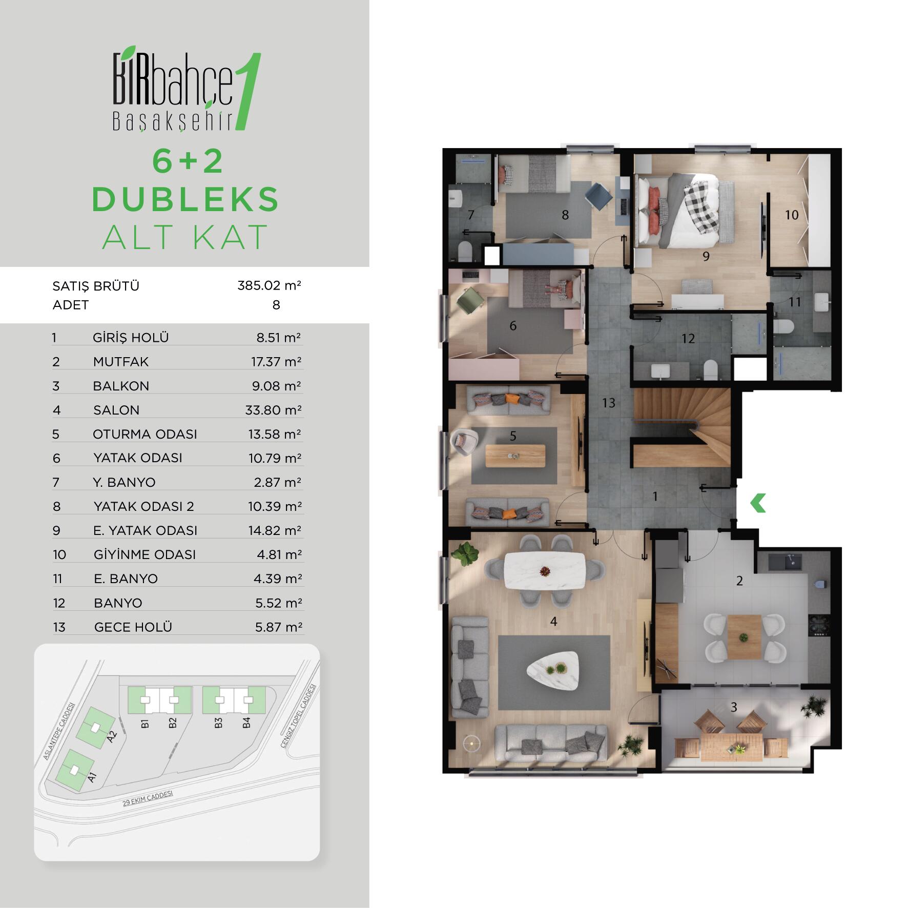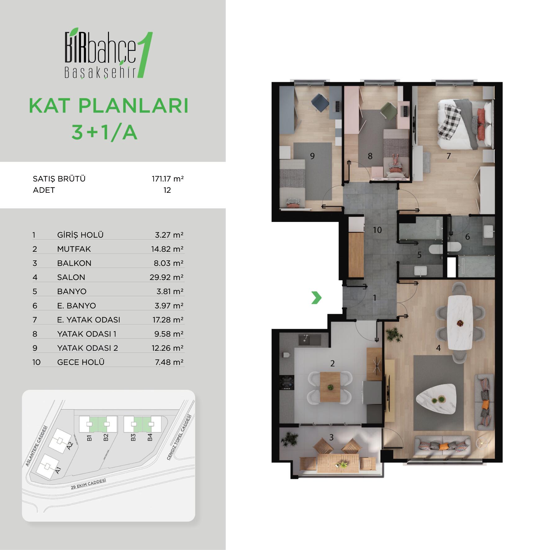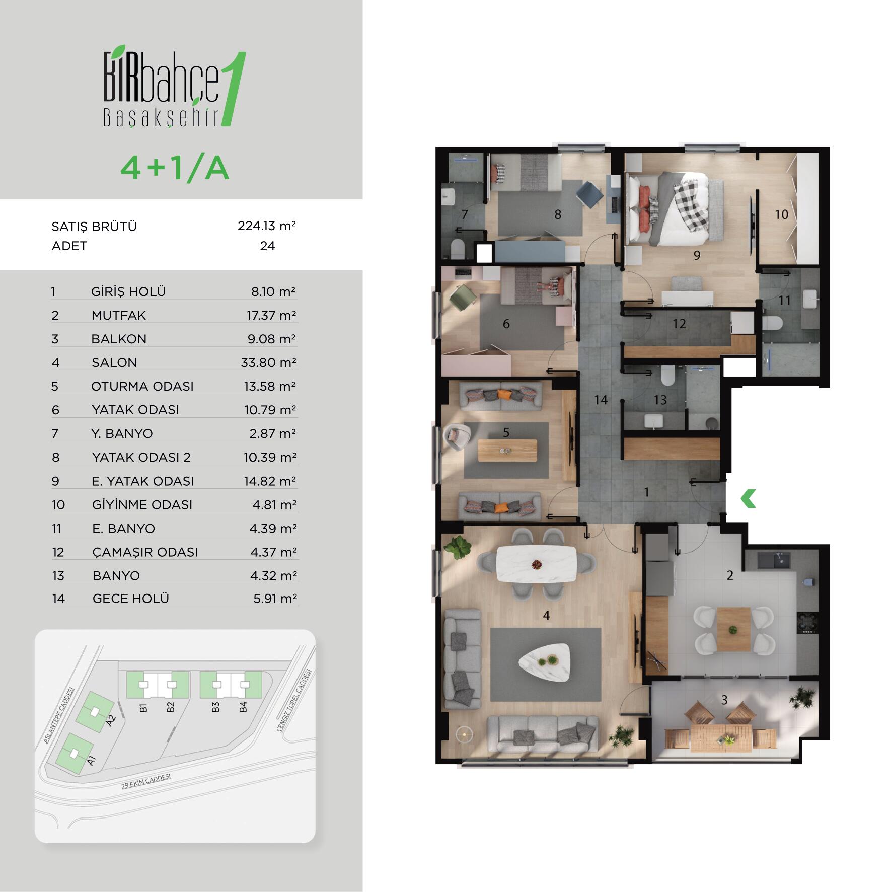 Birbahçe Başakşehir 1 предлагает 60 резиденций, в том числе 3+1, 4+1, 4+2 дуплексы и 6+2 дуплексы. Они варьируются от 171 м2 до 385 м2 и включают в себя варианты с большими террасами и частным садом. Каждый блок спроектирован с просторными макетами, большим количеством естественного света и функциональными кухнями и жилыми помещениями. Birbahçe Başakşehir 2 имеет 48 квартир и 5 эксклюзивных вилл, построенных на участке площадью 7000 м2. Единицы поставляются в форматах 3+1 и 4+1, некоторые из которых предлагают большие балконы и частные сады площадью от 85 м2 до 145 м2. Виллы и апартаменты предназначены для обеспечения конфиденциальности, гибкости и высокого уровня современной жизни.