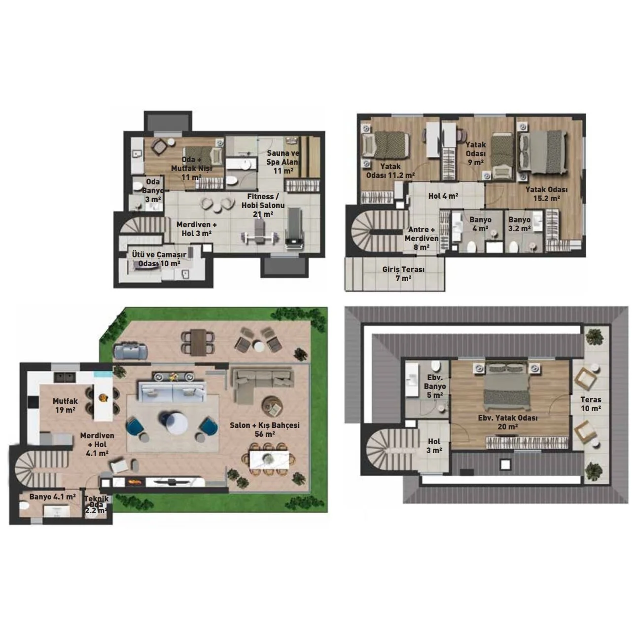 Особенности Living Space Проект предлагает два типа вилл: 4+1 трехэтажные виллы площадью 212 м2 и 6+1 четырехэтажные виллы площадью 286 м2. Каждый дом находится на частном земельном участке площадью от 537 м2 до 806 м2, с двумя частными парковочными местами, большими ландшафтными садами и открытыми жилыми помещениями. Все виллы включают такие функции, как теплицы для хобби, зоны барбекю и обширные стеклянные проемы, которые приглашают естественный свет и вид на лес в каждую комнату. Макеты идеально подходят для семейной жизни, развлечения гостей или наслаждения образом жизни, ориентированным на природу.