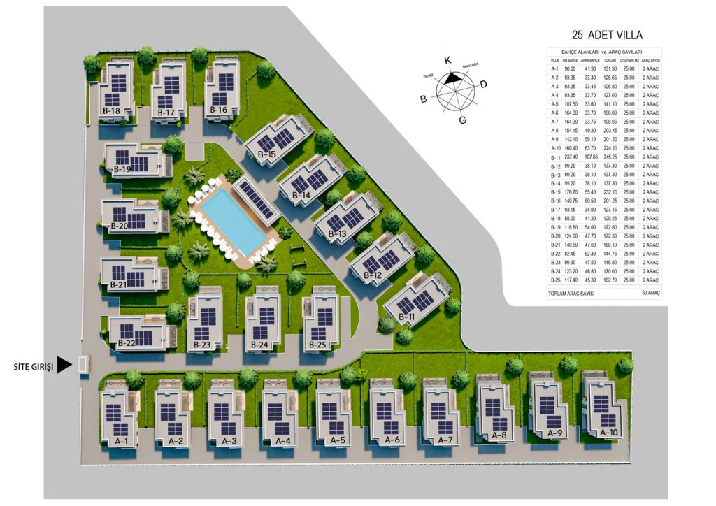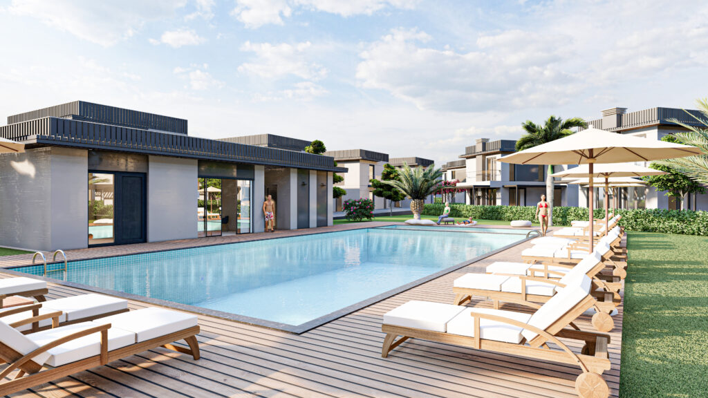 Архитектура Azure Villaları отражает современную элегантность и продуманный дизайн, с вниманием к деталям в каждом углу. Виллы имеют современные фасады с чистыми линиями и премиальными материалами, подчеркивая эстетическую привлекательность и долговечность. Высококачественная отделка используется повсеместно, с такими функциями, как частные лифты, централизованные системы отопления и просторные макеты, которые сочетают роскошь с практичностью.