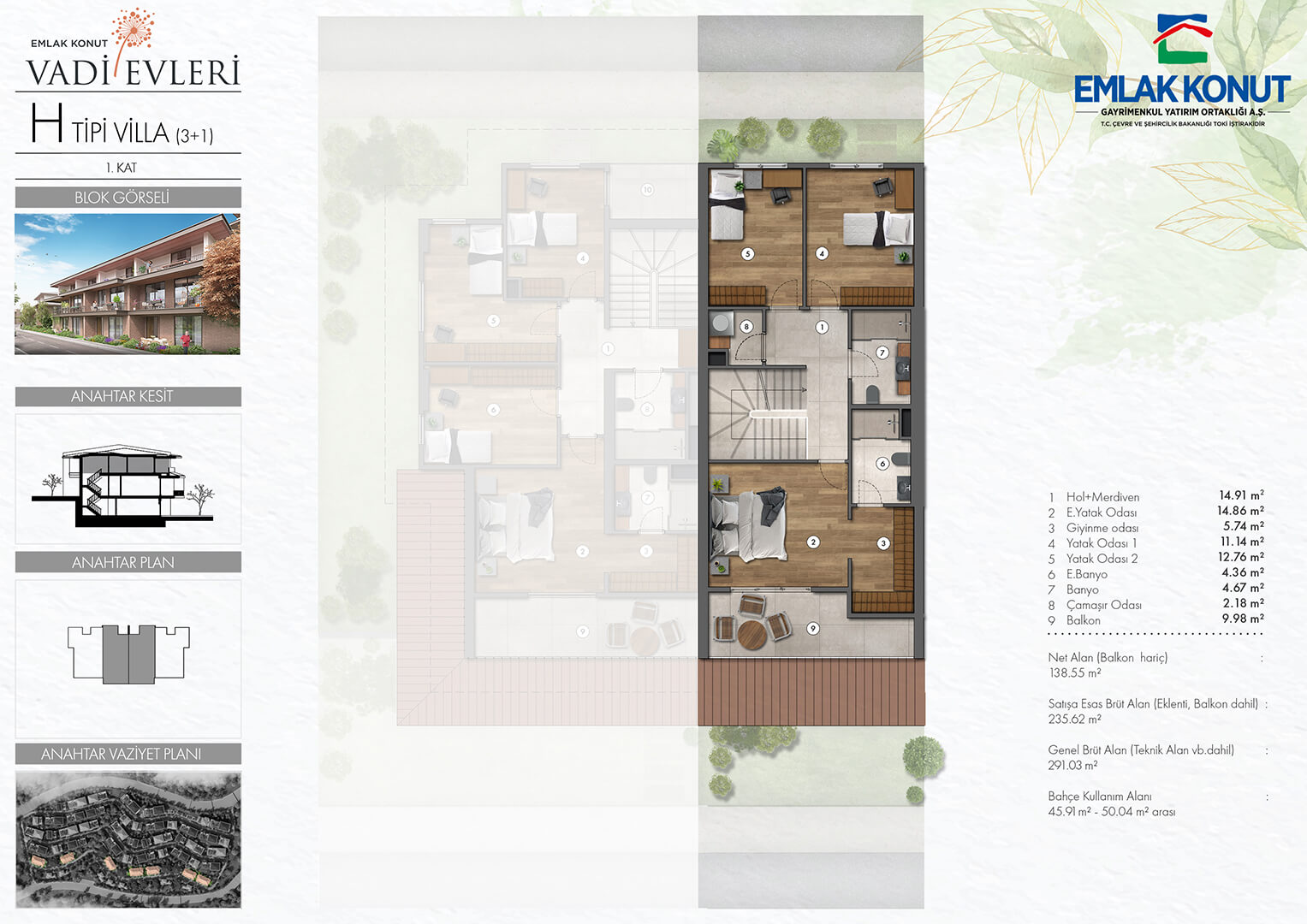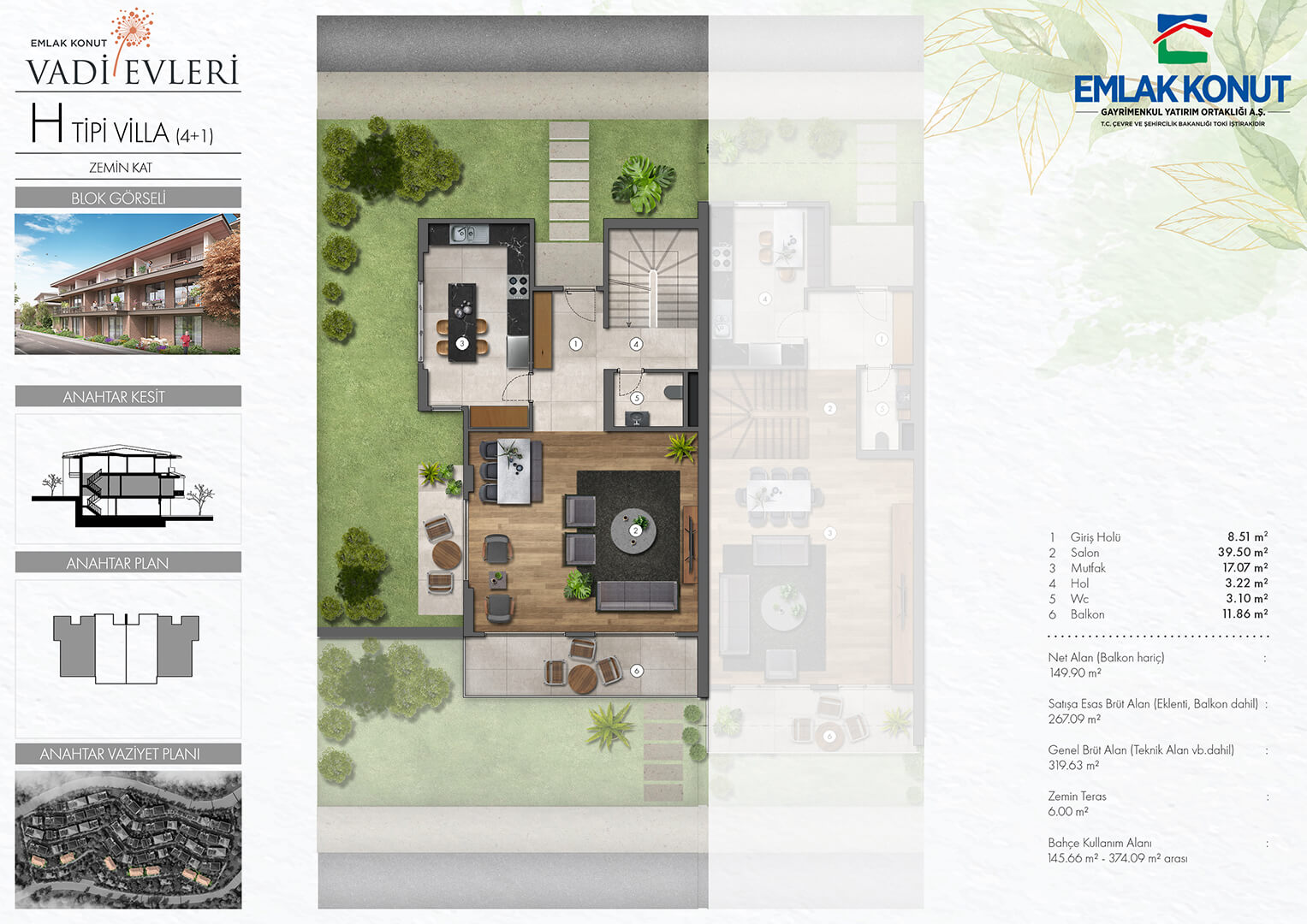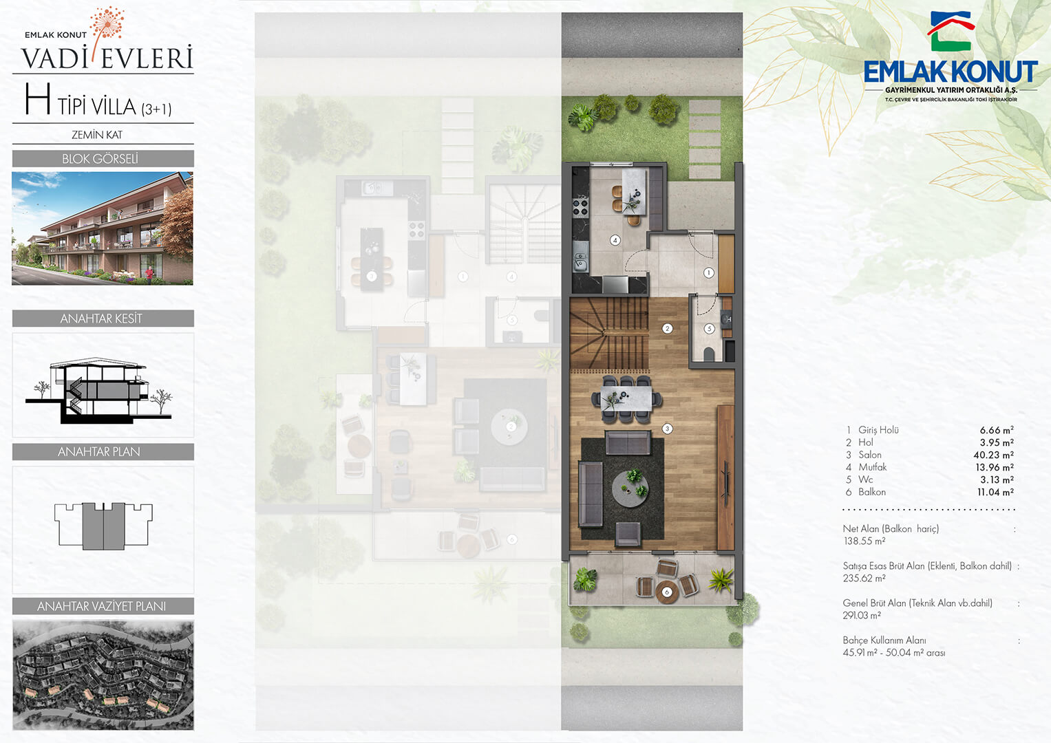Vadi Evleri, разработанный Emlak Konut GYO в стамбульском районе Башакшехир (Бахчекент), представляет собой малоэтажное жилое сообщество, подчеркивающее горизонтальную жизнь в человеческом масштабе. Проект включает в себя сочетание апартаментов (2+1-5+1) и вилл-близнецов, расположенных рядом с зелеными коридорными пространствами, способствующими атмосфере жилой деревни.