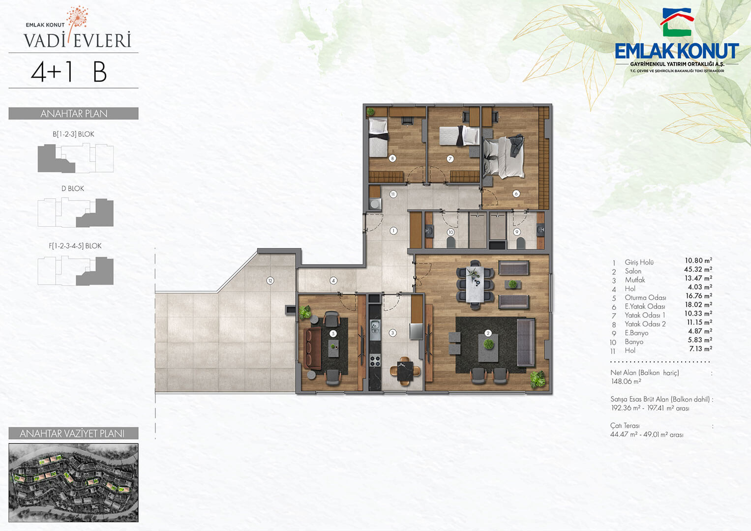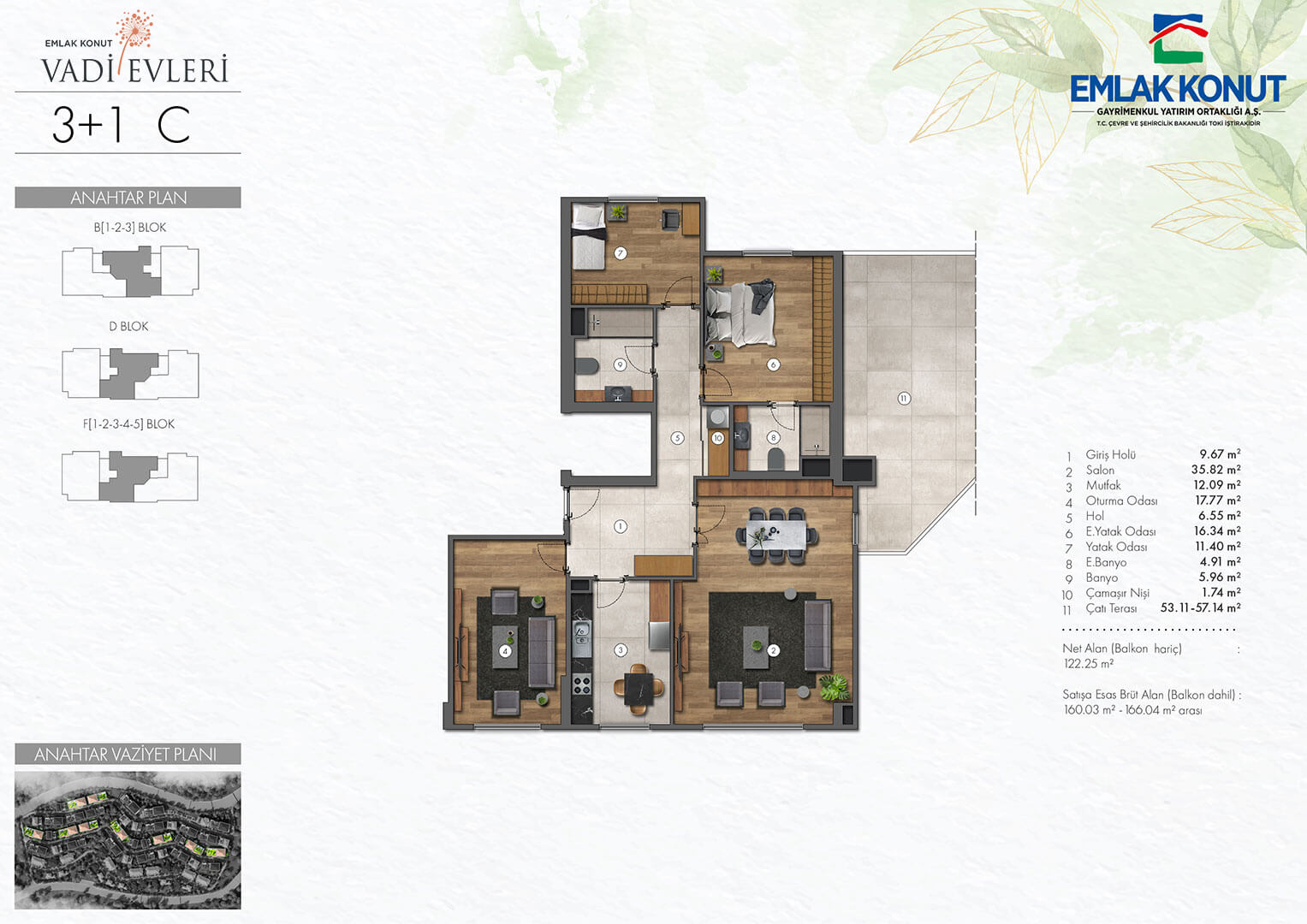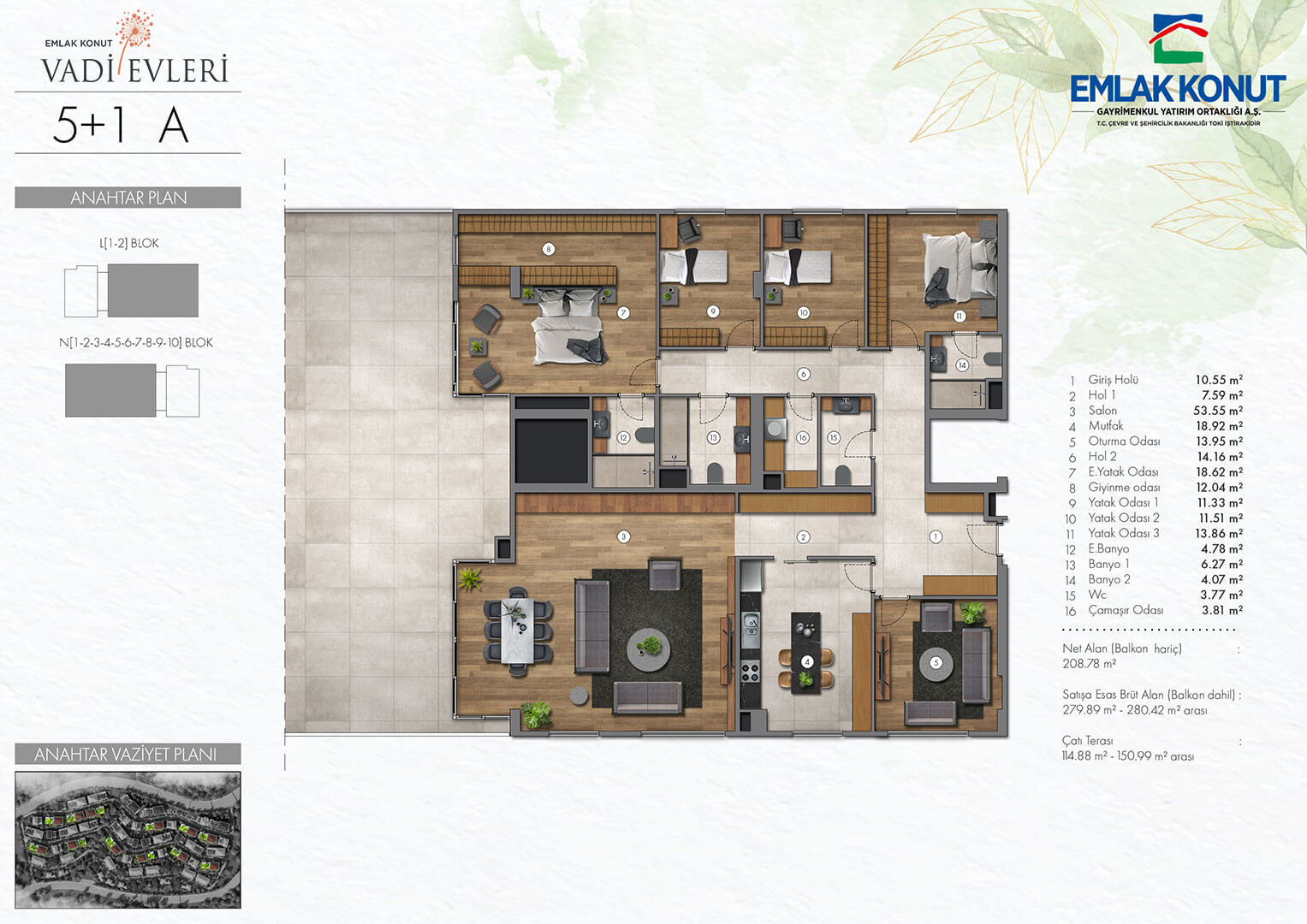 Конфигурации блоков варьируются от 2+1 апартаментов (~112 м2) до более крупных типов, включая 3+1, 4+1 и 5+1, а также 4+2 виллы-близнецы (~210 м2). Многие из них включают частные террасы, сады или дуплексные макеты. Интерьеры оснащены современными кухнями, ванными комнатами и щедрым естественным светом.