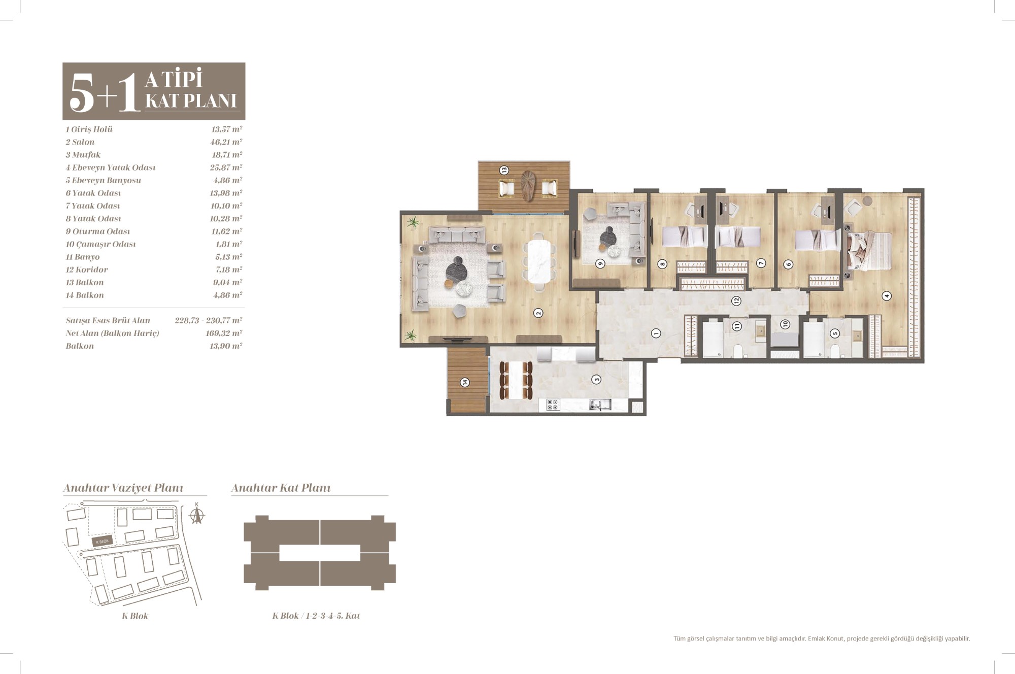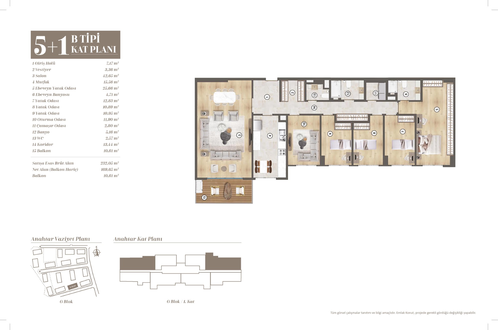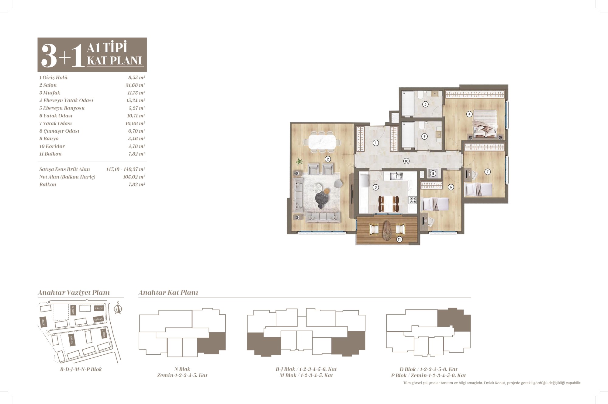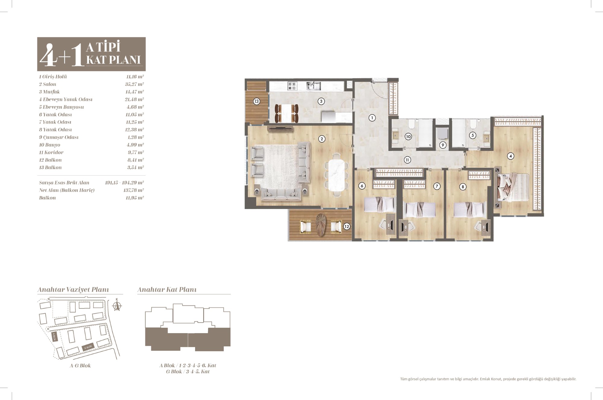 Блоки варьируются от 86 до 226 м2, предлагая макеты от компактных квартир 1+1 до просторных вилл 5+1. Резиденции включают щедрые балконы или сады, жилые районы с открытой планировкой, мастер-люксы и доступ на балкон. Виллы имеют частные террасы и более эксклюзивные макеты. Планы этажей доступны для типологий от 1+1 до 5+1.