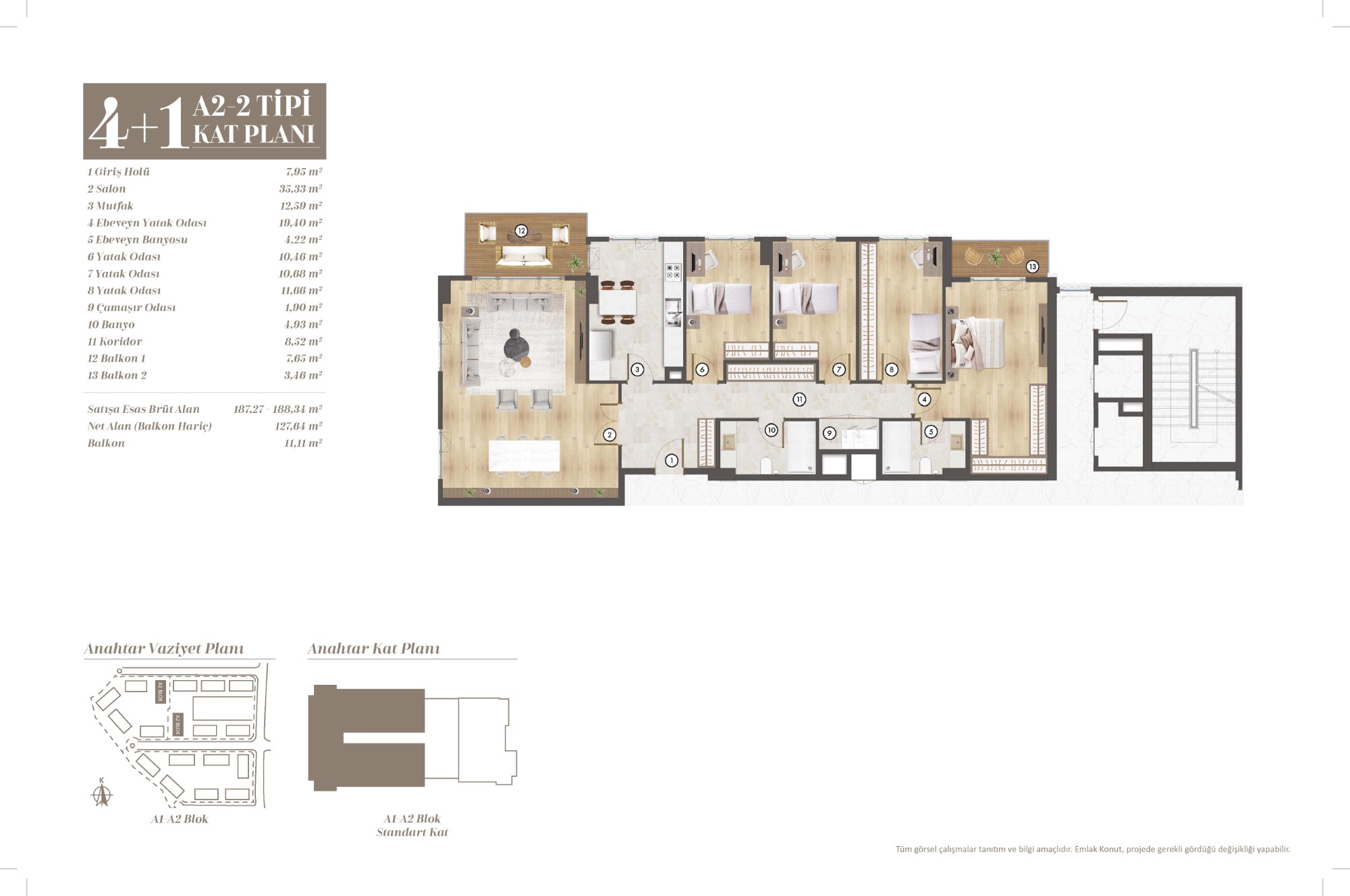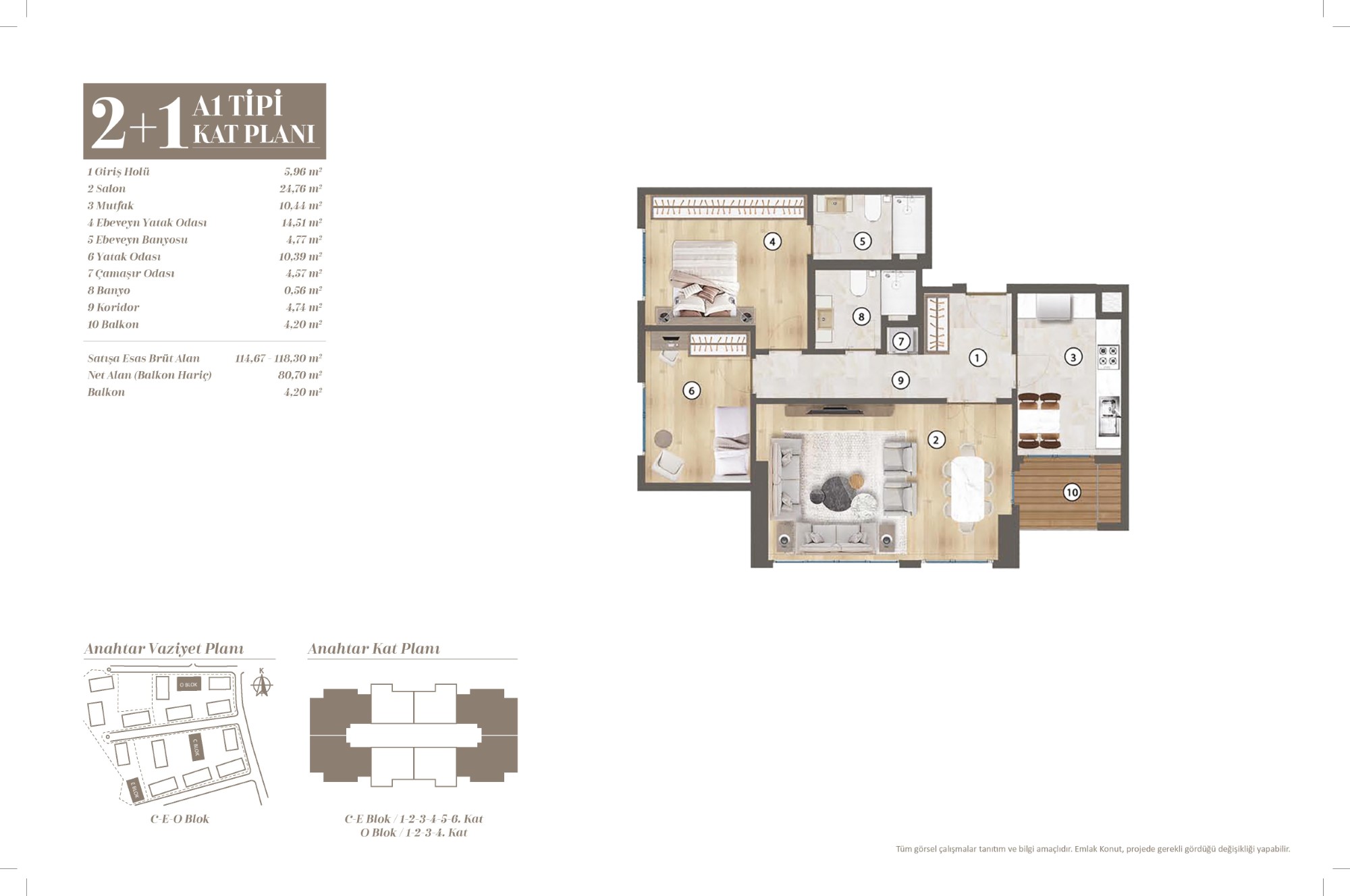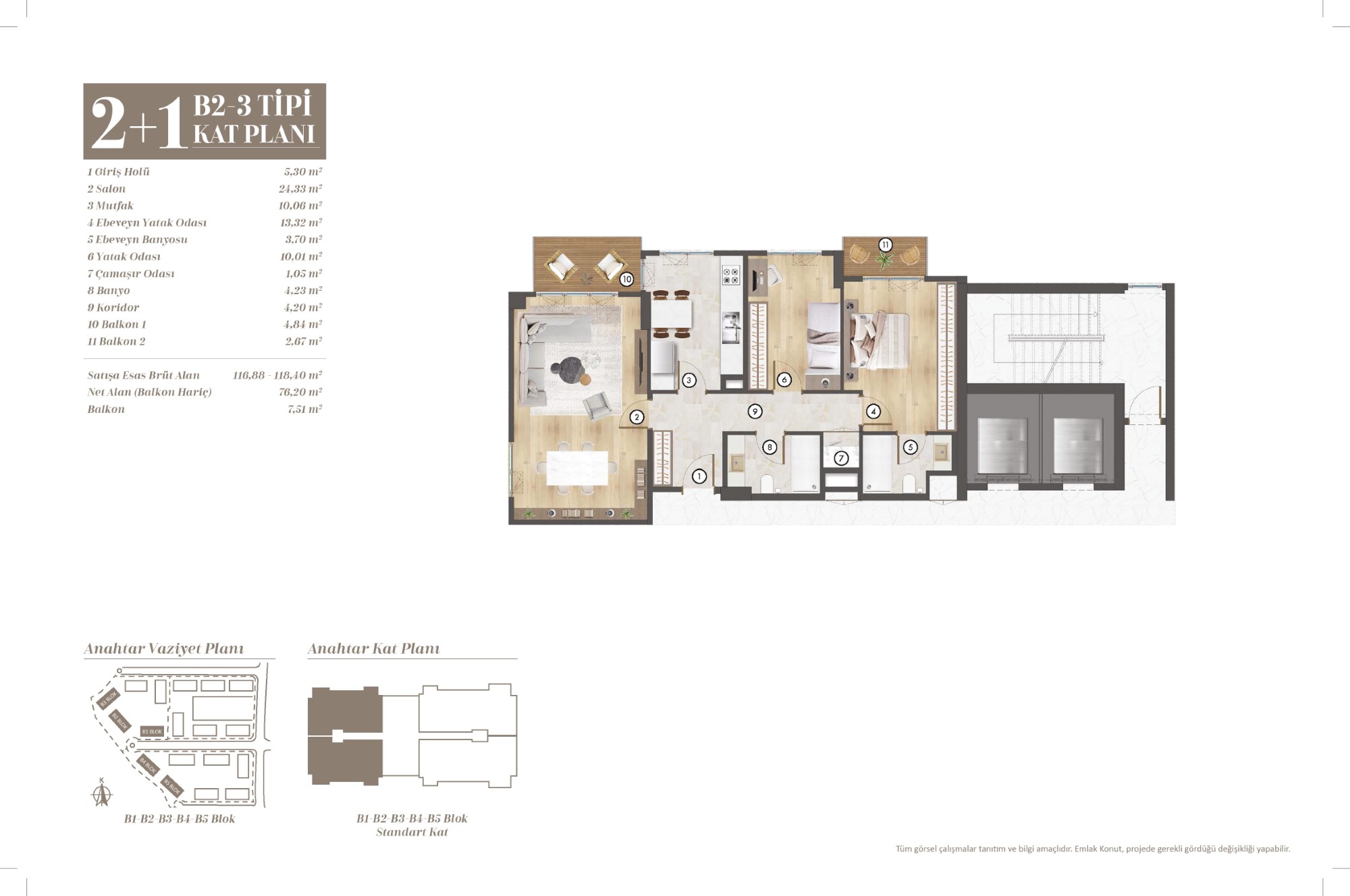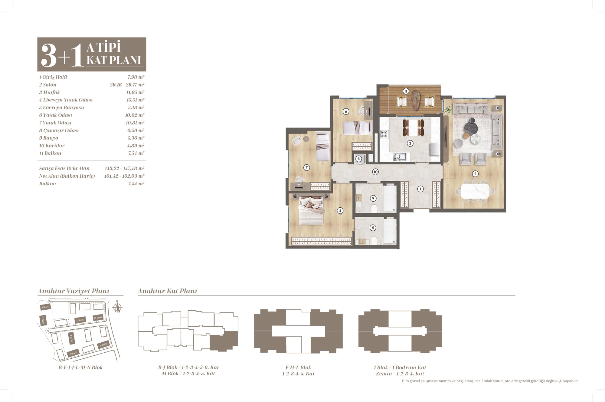 Блоки варьируются от 86 до 226 м2, предлагая макеты от компактных квартир 1+1 до просторных вилл 5+1. Резиденции включают щедрые балконы или сады, жилые районы с открытой планировкой, мастер-люксы и доступ на балкон. Виллы имеют частные террасы и более эксклюзивные макеты. Планы этажей доступны для типологий от 1+1 до 5+1.